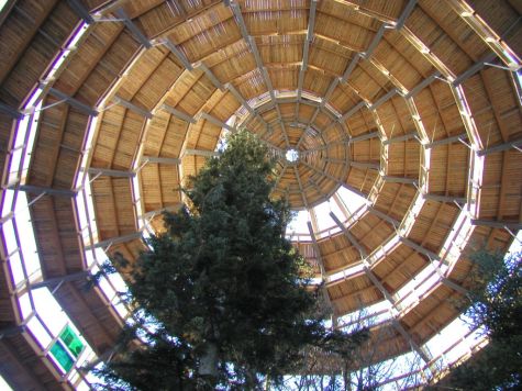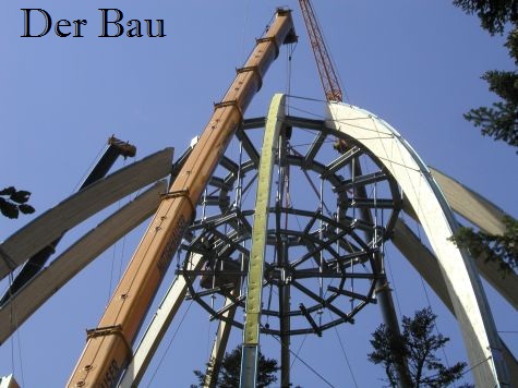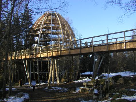 Ein 44 Meter hoher Turm, einzigartig in seiner luftigen Architektur. Über 500m windet sich die Rampe im Turm um die 3 uralten Bäume, die bis zu 38m hohen Tannen und Buchen.